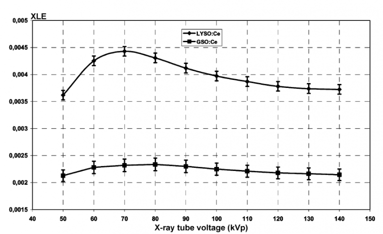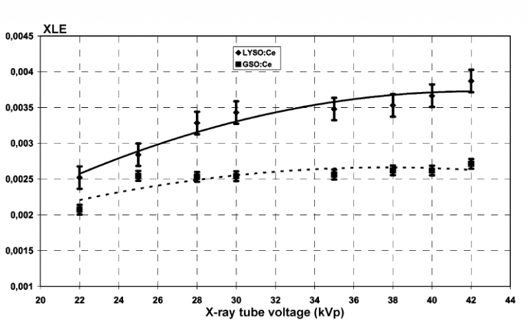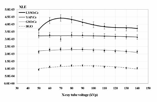 The x-ray luminescence efficieny (XLE) of Ce:LYSO, Ce:YAP, Ce:GSO and BGO as determined by the experimental data for x-ray tube voltages between 50–140 kVp (general radiography).Points: measured data, line: fitted curve.