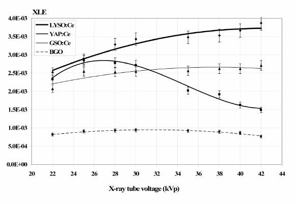 The x-ray luminescence efficiency (XLE) of Ce:LYSO, Ce:YAP, Ce:GSO and BGO as determined by the experimental data for x-ray tube voltages between 22–42kVp(mammography).Points: measured data, line: fitted curve.